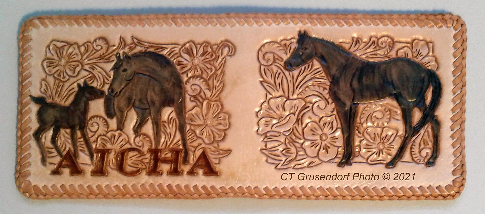 Name or initials may be added to carved and tooled leather. The design may wrap around the name, or the name may be laid overtop of the design.